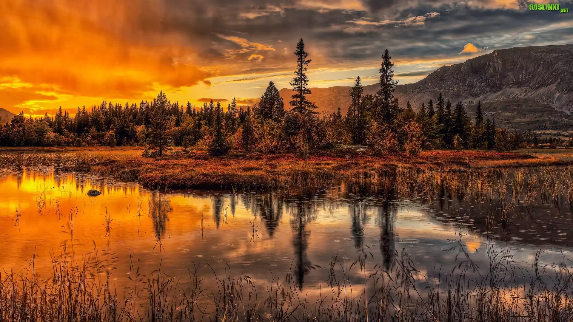 Rośliny: Góry, Jesień, Rzeka, Zachód słońca, Drzewa, Szuwary