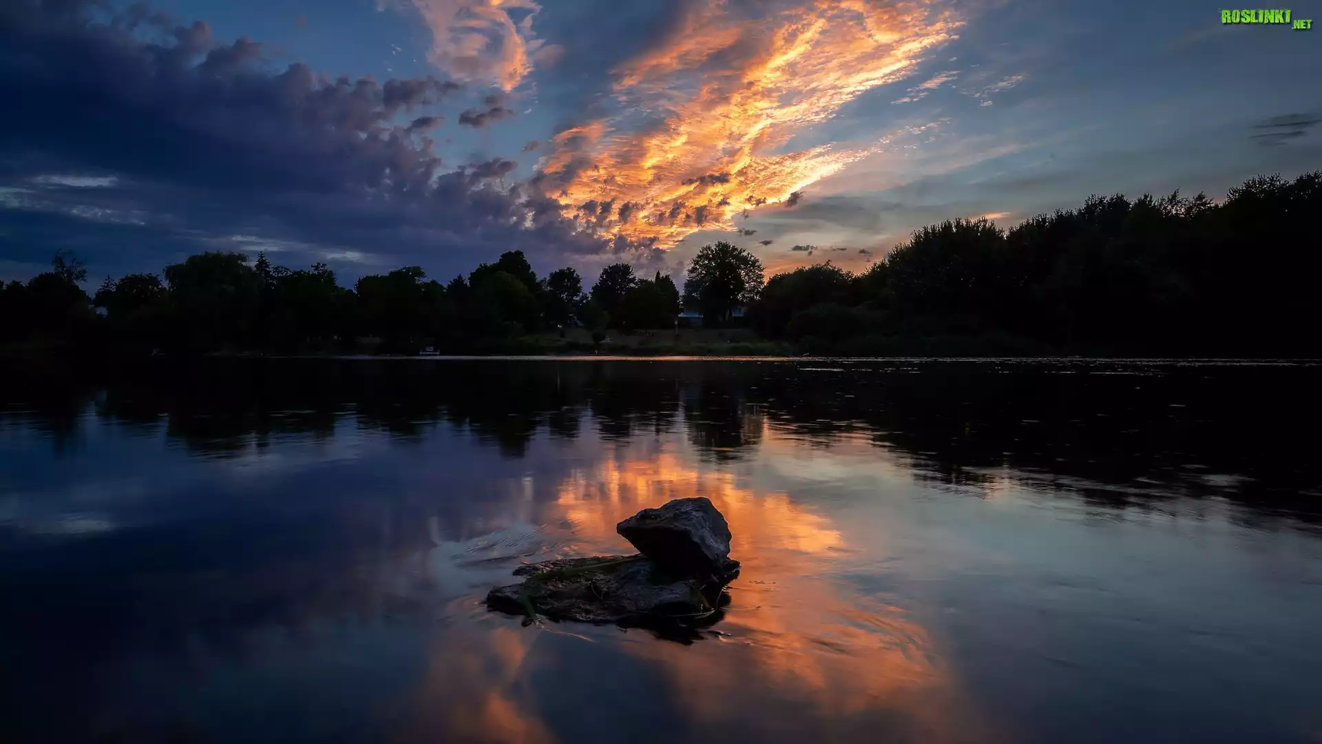 Rzeka Missisipi River, Drzewa, Chmury, Zachód słońca, Carleton Place, Prowincja Ontario, Kanada