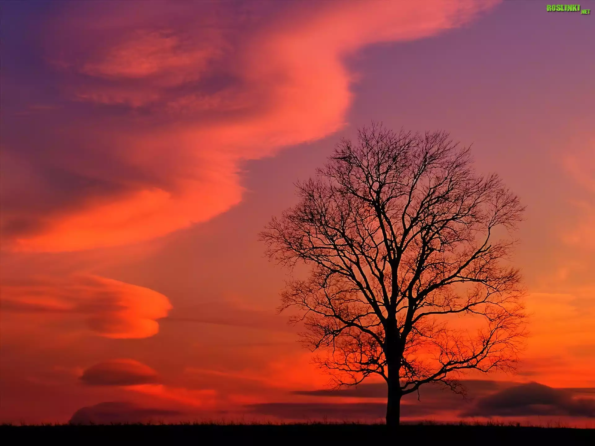 Rośliny: Zachód, Słońca, Chmury, Samotne, Drzewo