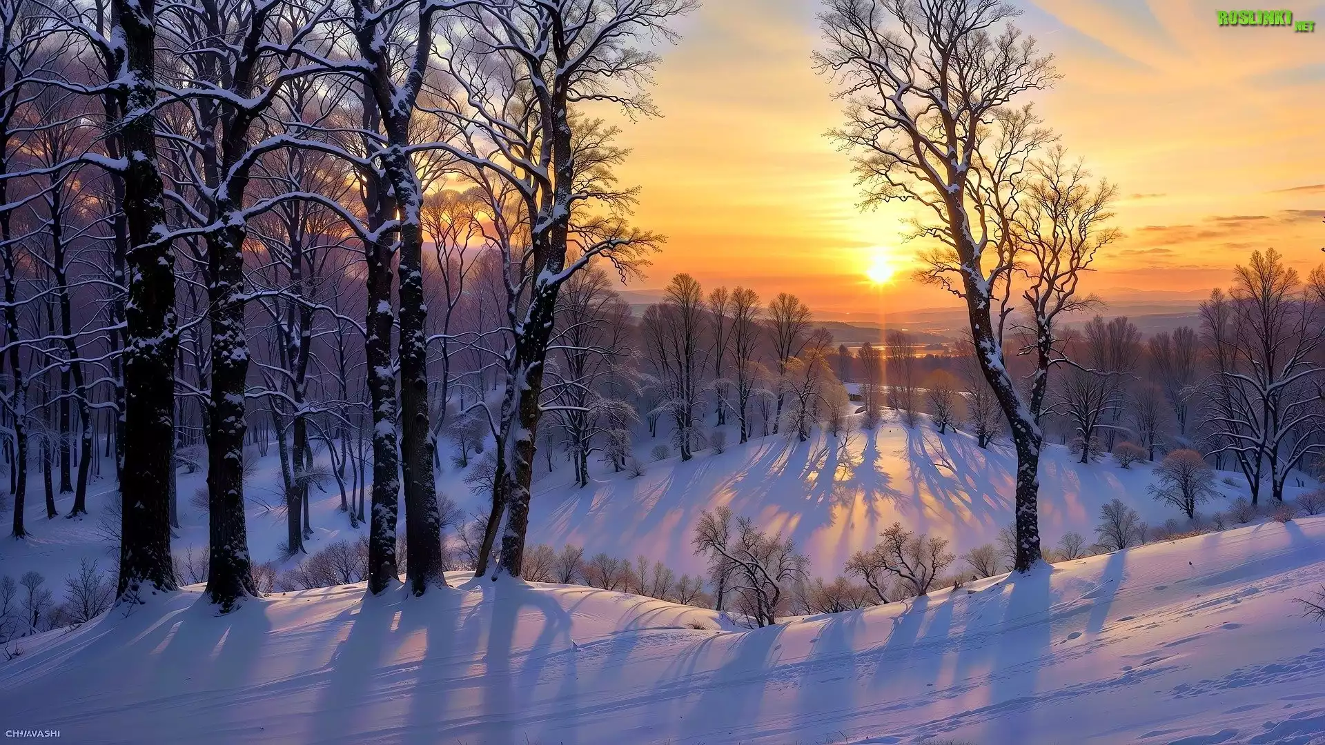 Rośliny: Zima, Zachód słońca, Śnieg, Drzewa