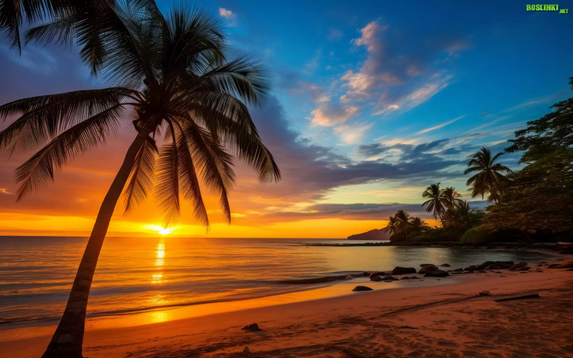 Rośliny: Morze, Zachód słońca, Plaża, Palmy