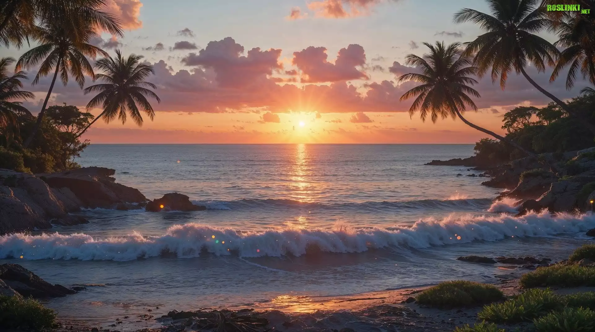 Rośliny: Morze, Zachód słońca, Palmy, Wybrzeże
