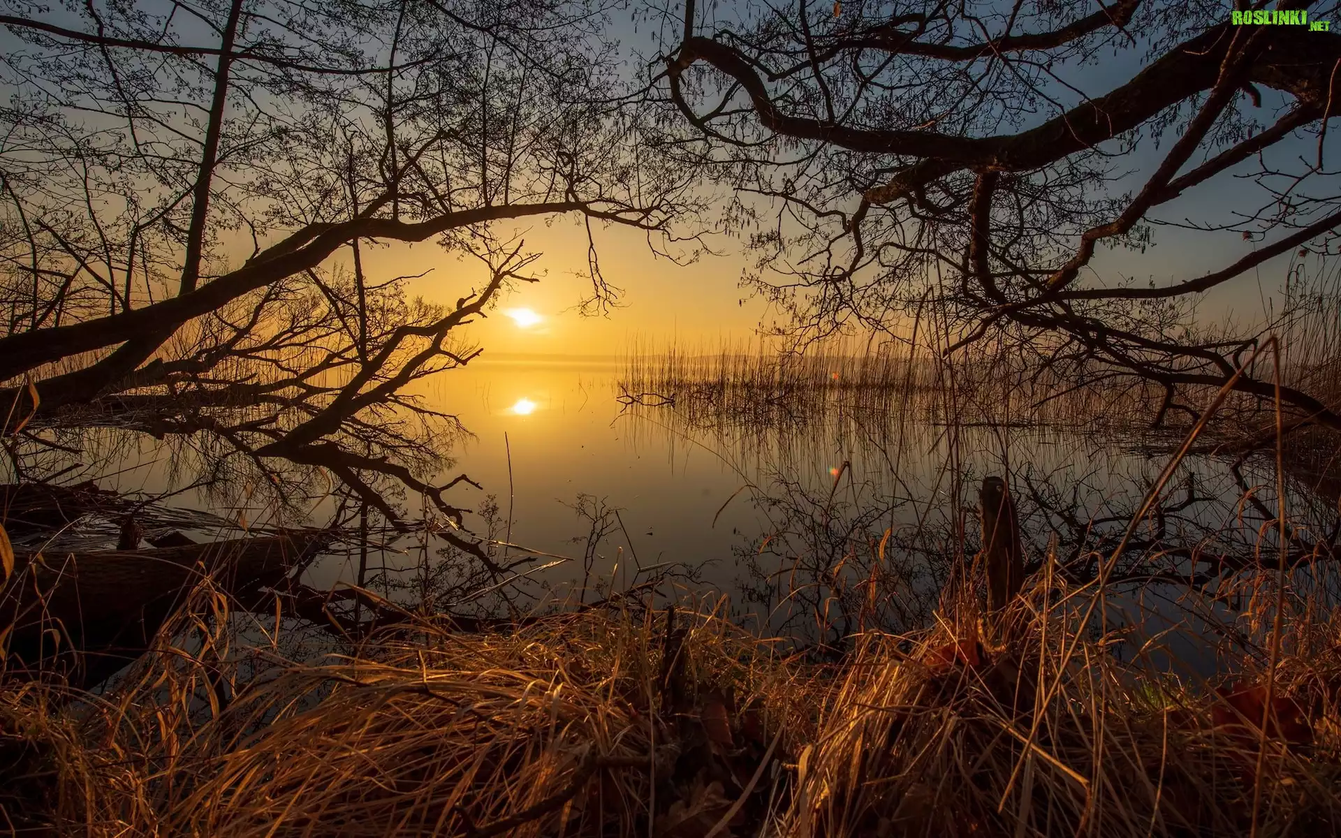 Rośliny: Zachód słońca, Jezioro, Drzewa, Szuwary, Gałęzie