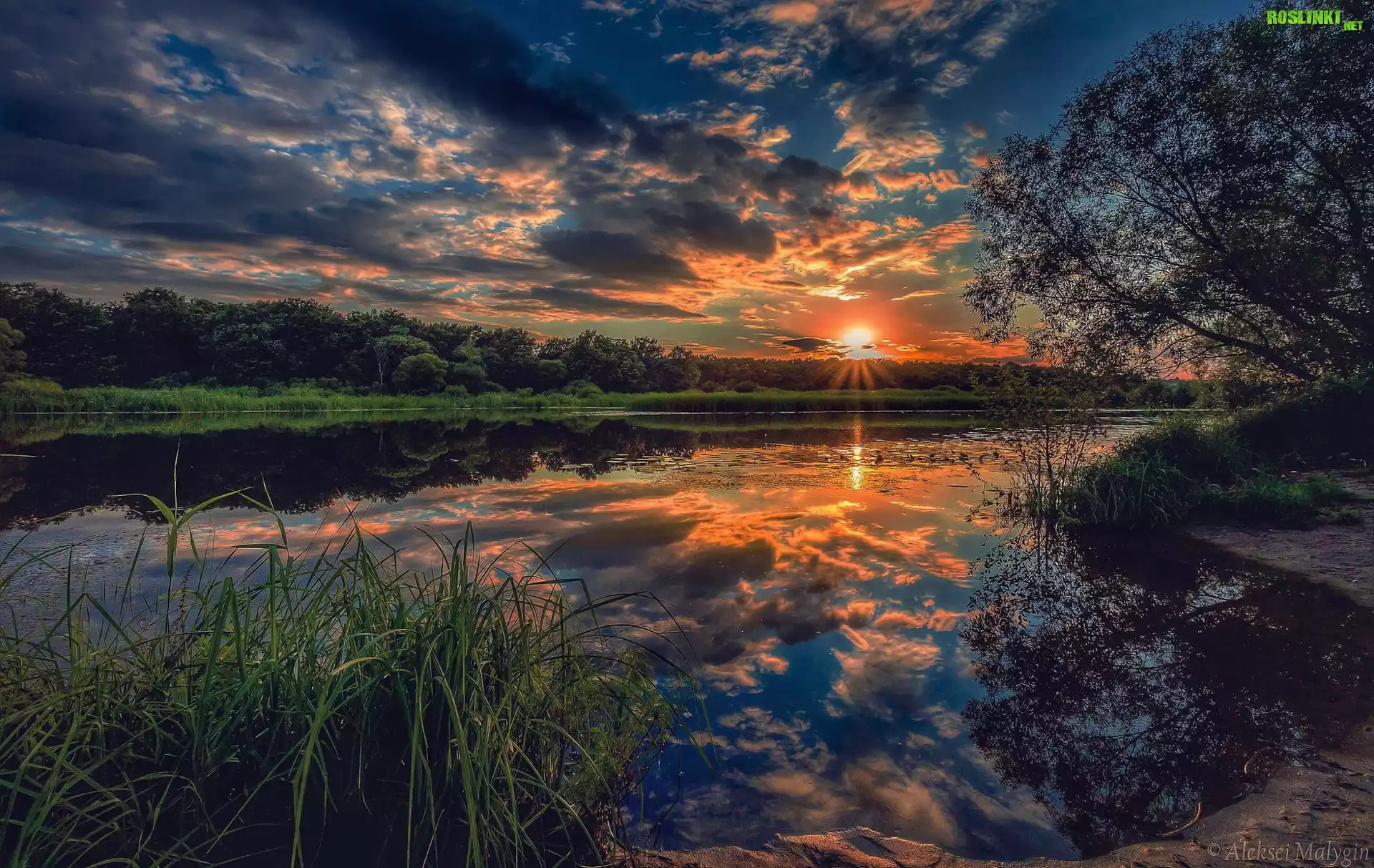 Rośliny: Zachód słońca, Jezioro, Szuwary, Drzewa