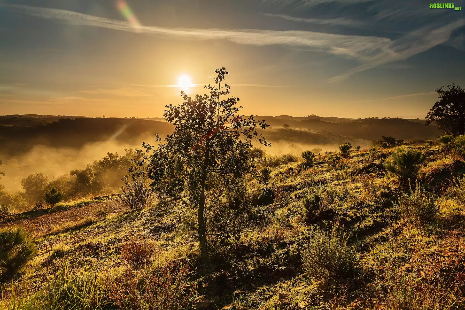 Rośliny: Zachód, Słońca, Mgła, Trawa, Drzewo