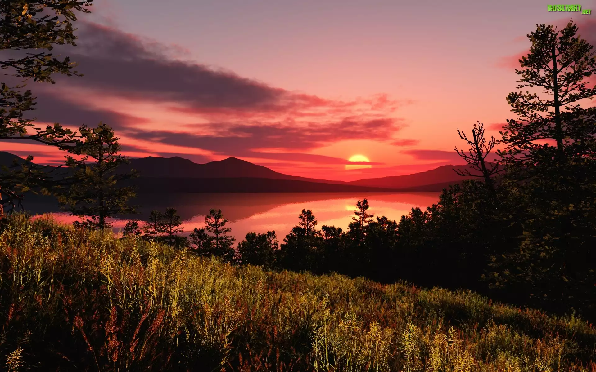 Rośliny: Zachód Słońca, Trawa, Drzewa