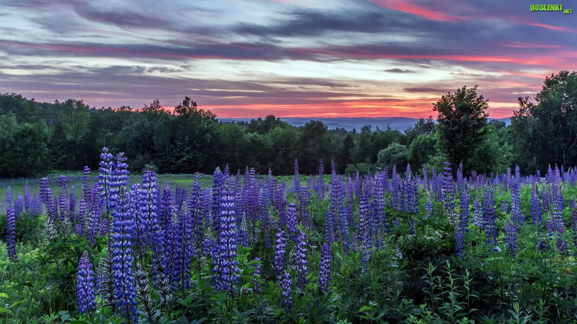 Rośliny: Łąka, Łubin, Drzewa, Zachód słońca