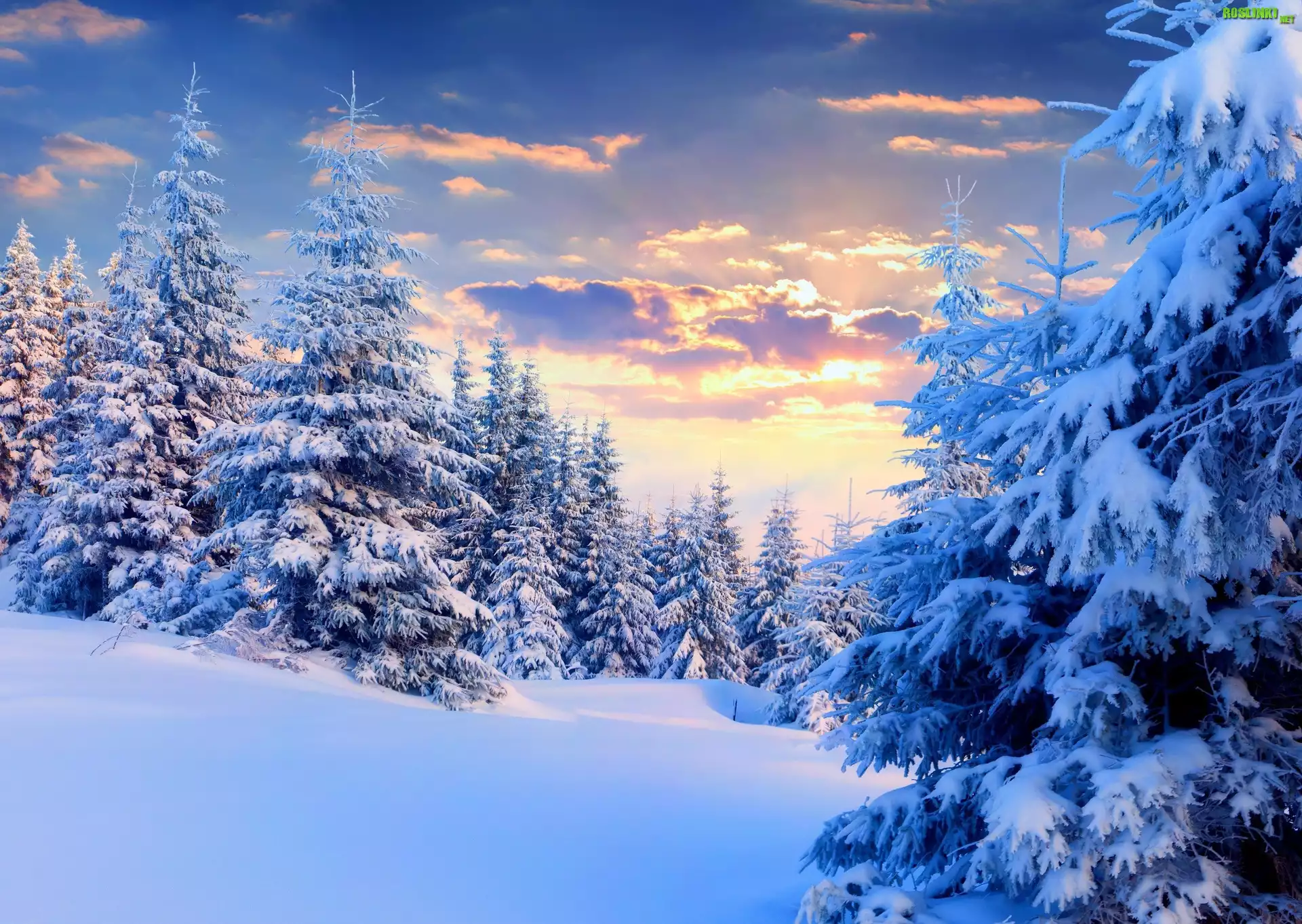 Rośliny: Wschód Słońca, Las, Świerki, Zima