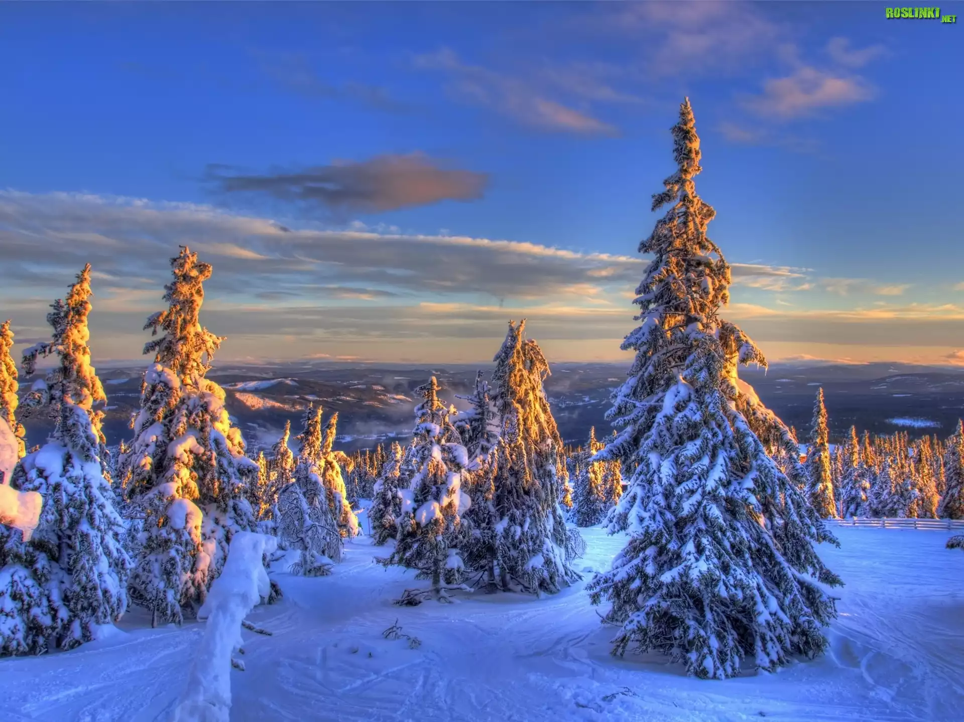 Rośliny: Zachód, Słońca, Świerki, Zima