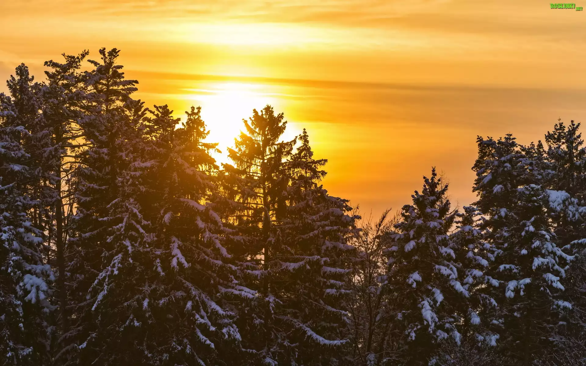 Rośliny: Zachód, Słońca, Świerki, Zima