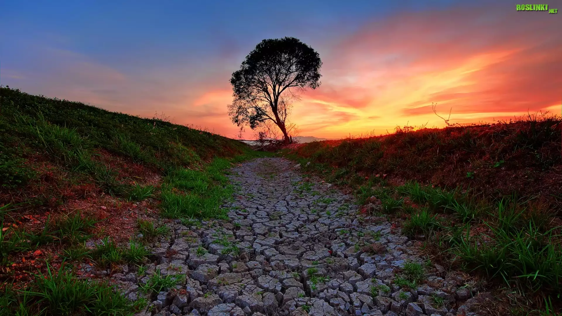 Rośliny: Zachód, Słońca, Droga, Spękana, Ziemia, Drzewo