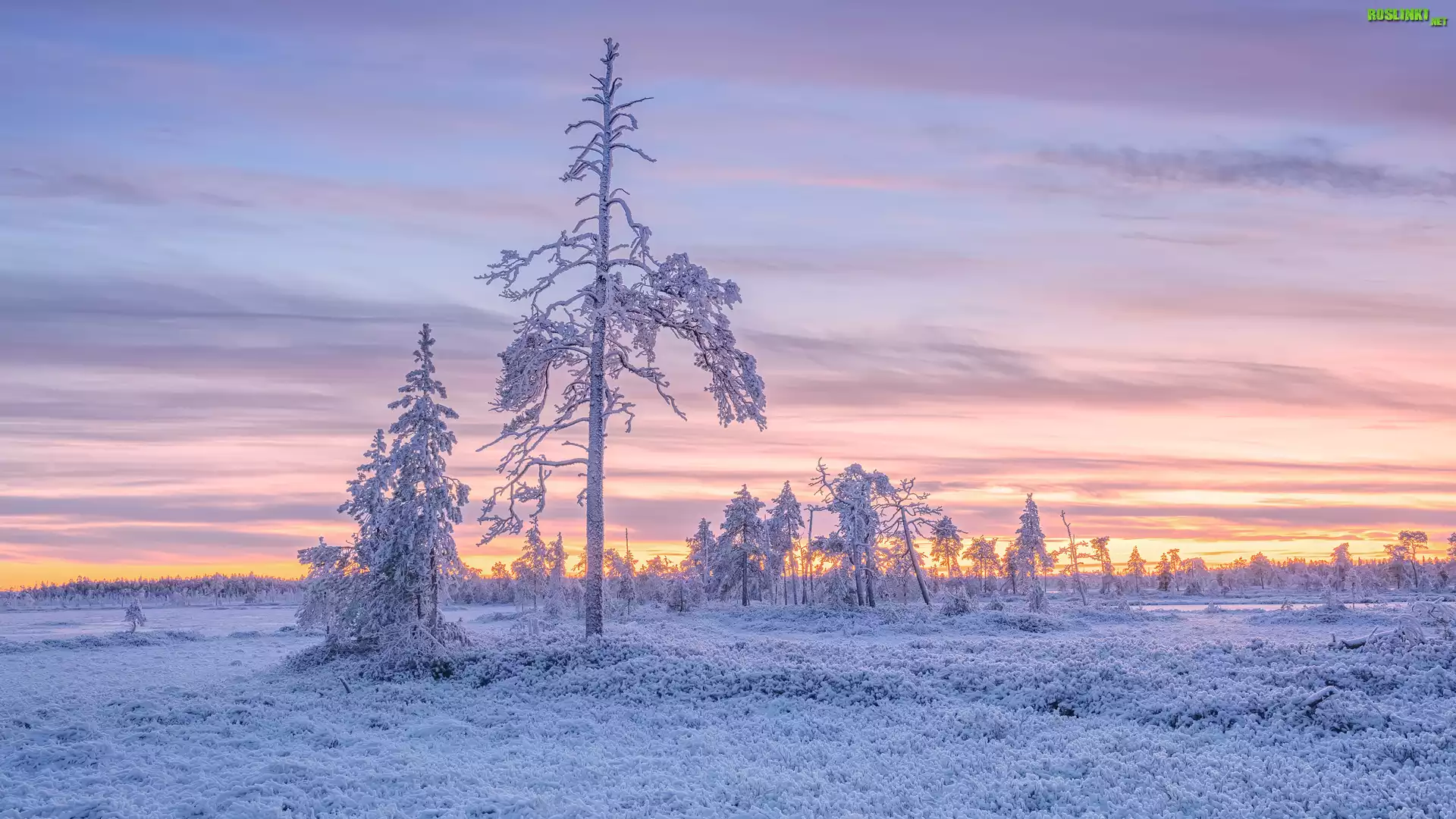 Rośliny: Ośnieżone, Drzewa, Niebo, Zachód słońca, Zima