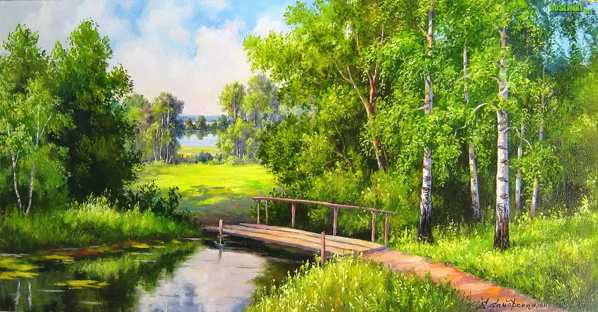 Rośliny: Zagajnik, Brzozy, Rzeka, Kładka, Lato