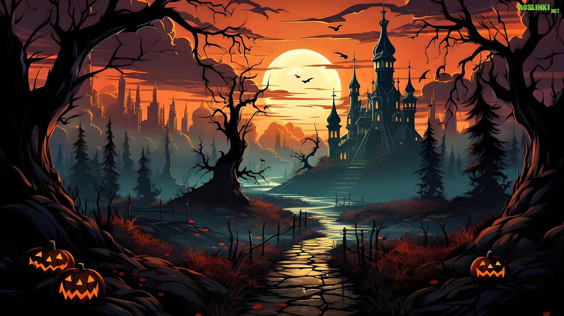 Rośliny: Dynie, Drzewa, Droga, Zamek, Zachód słońca, Grafika