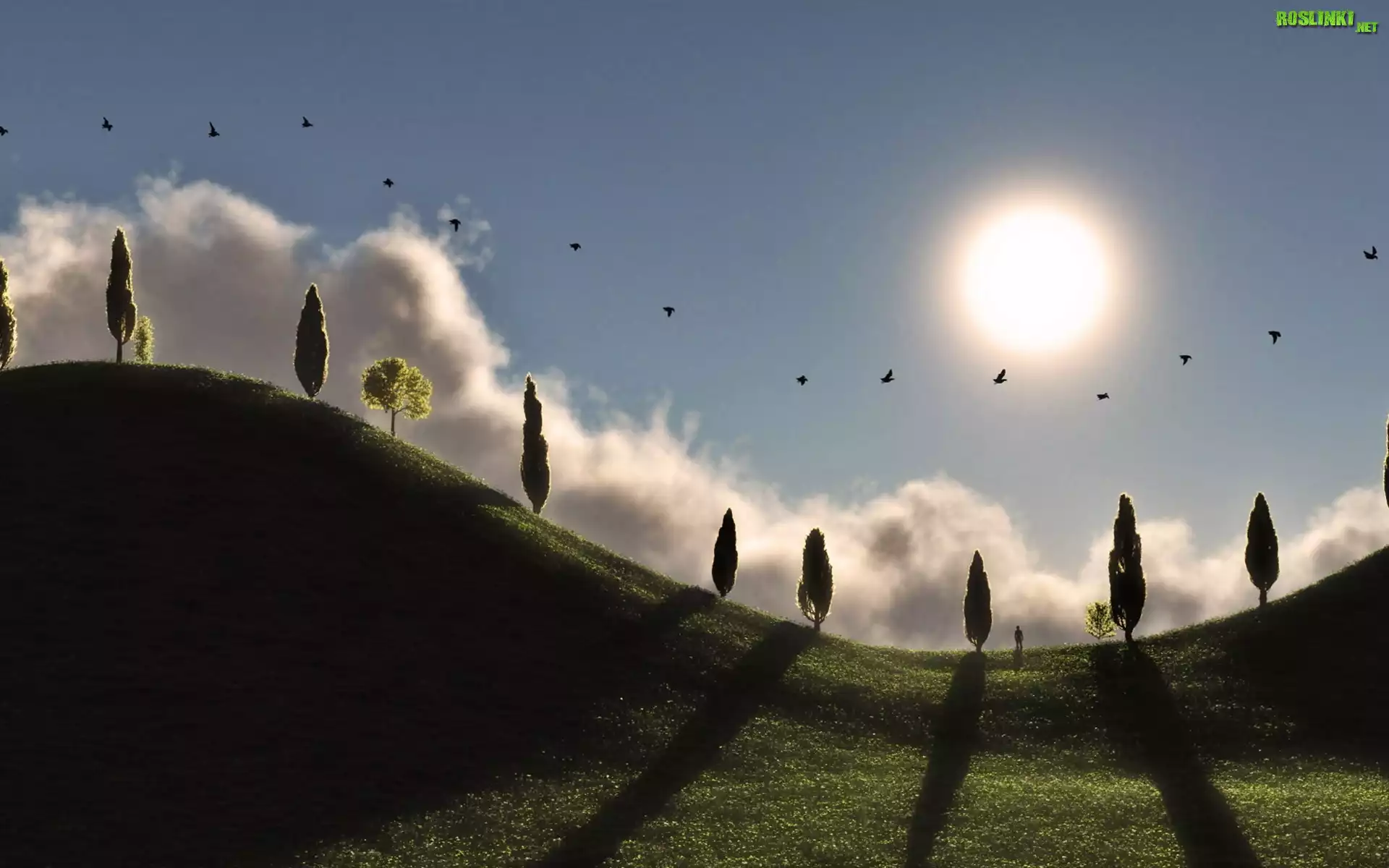 Rośliny: Zamglone, Słońce, Chmury, Ptaki, Drzewa, Cienie
