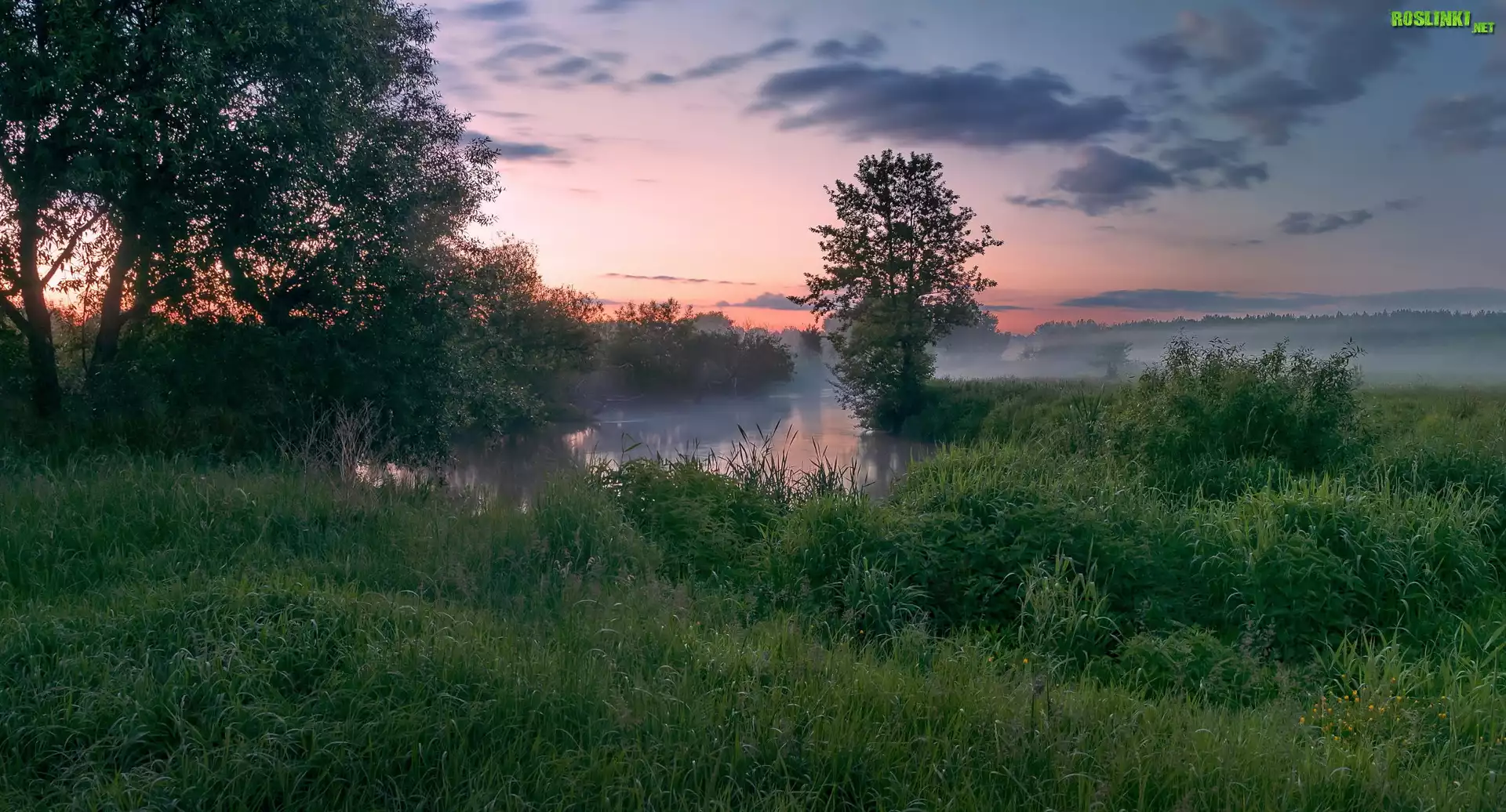 Rośliny: Świt, Mgła, Jezioro, Zarośla, Drzewa