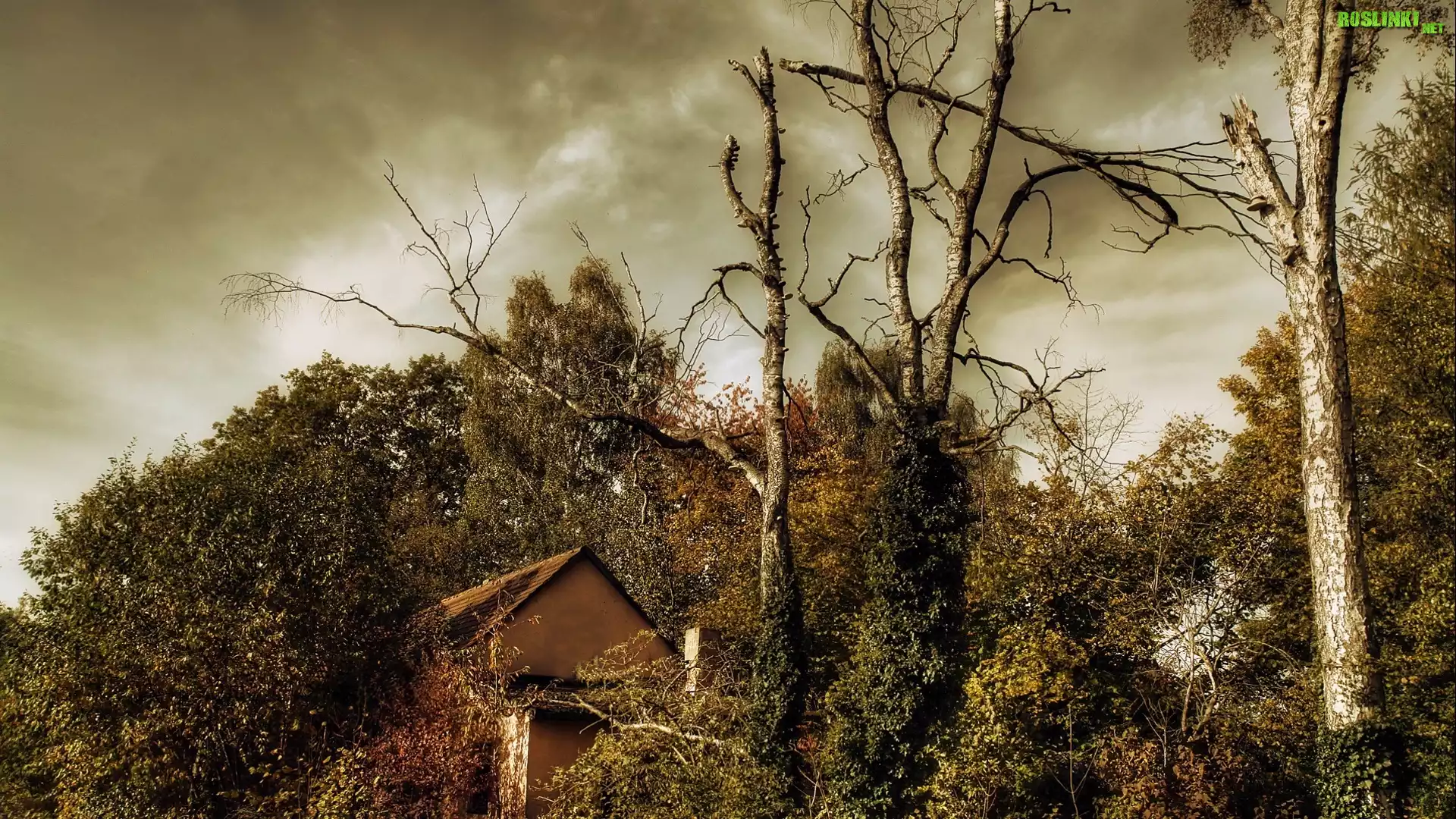 Rośliny: Zarośnięty, Dom, Drzewa, Pochmurne, Niebo