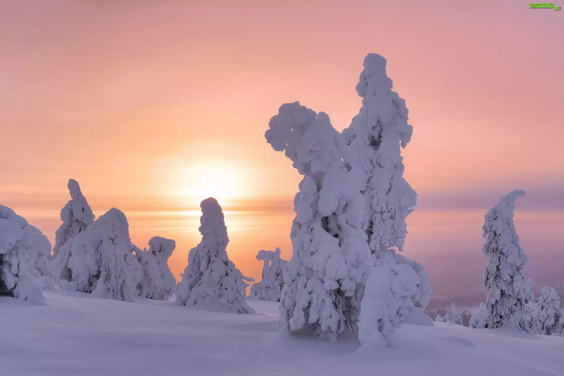 Zima, Zaśnieżone, Drzewa, Zachód słońca, Laponia, Finlandia