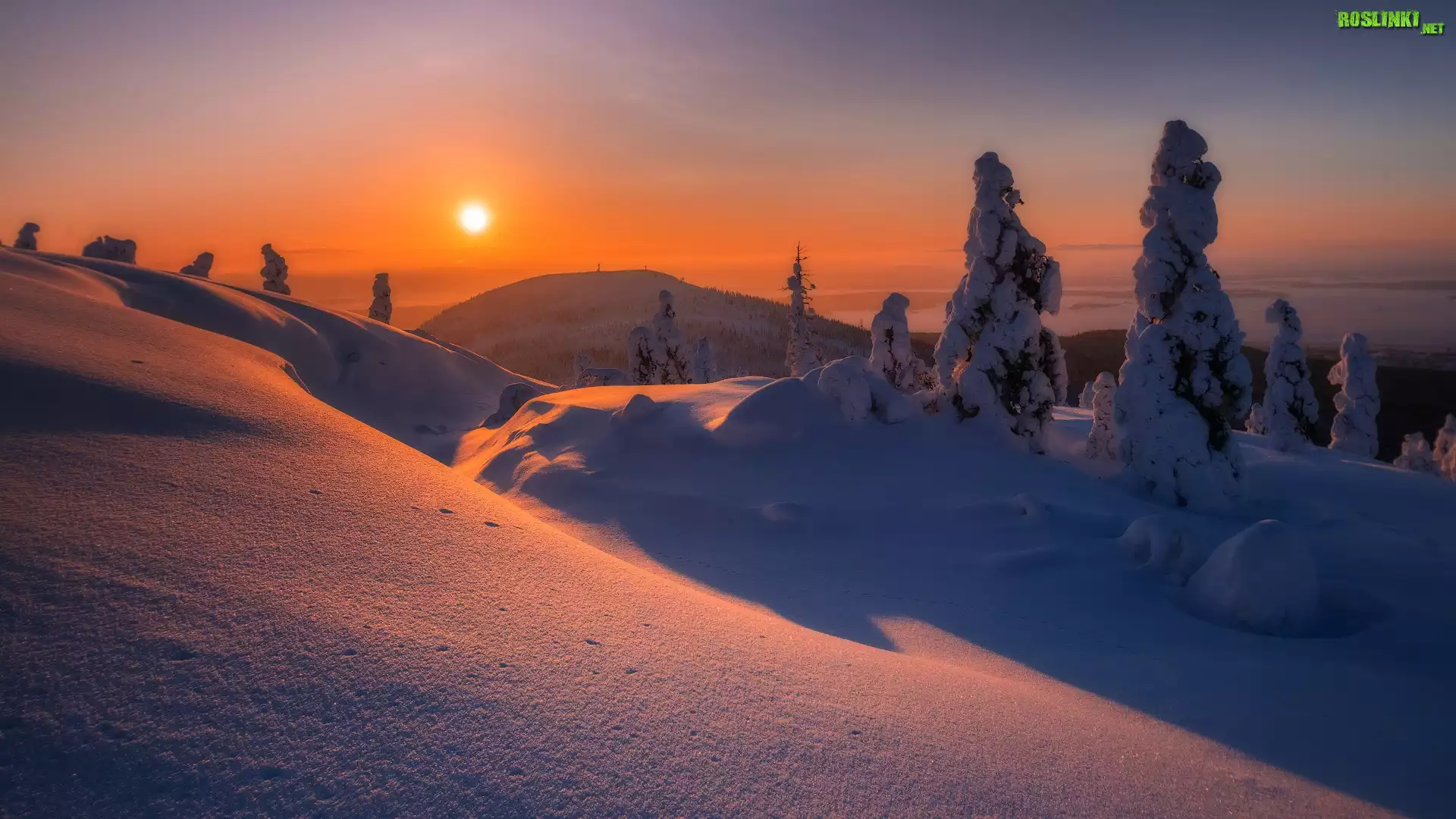 Rośliny: Zima, Śnieg, Drzewa, Zaspy, Zachód słońca, Góra
