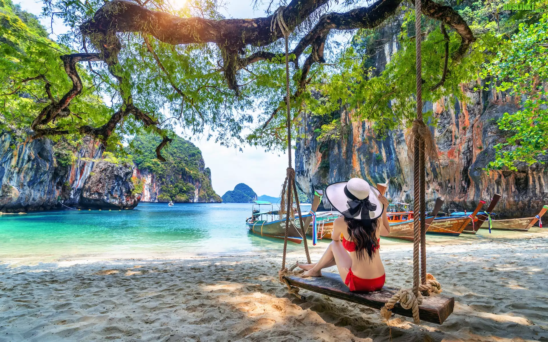 Zatoka, Kobieta, Kapelusz, Huśtawka, Promienie słońca, Drzewo, Łodzie, Skały, Wyspa Ko Lao, Prowincja Krabi, Tajlandia |