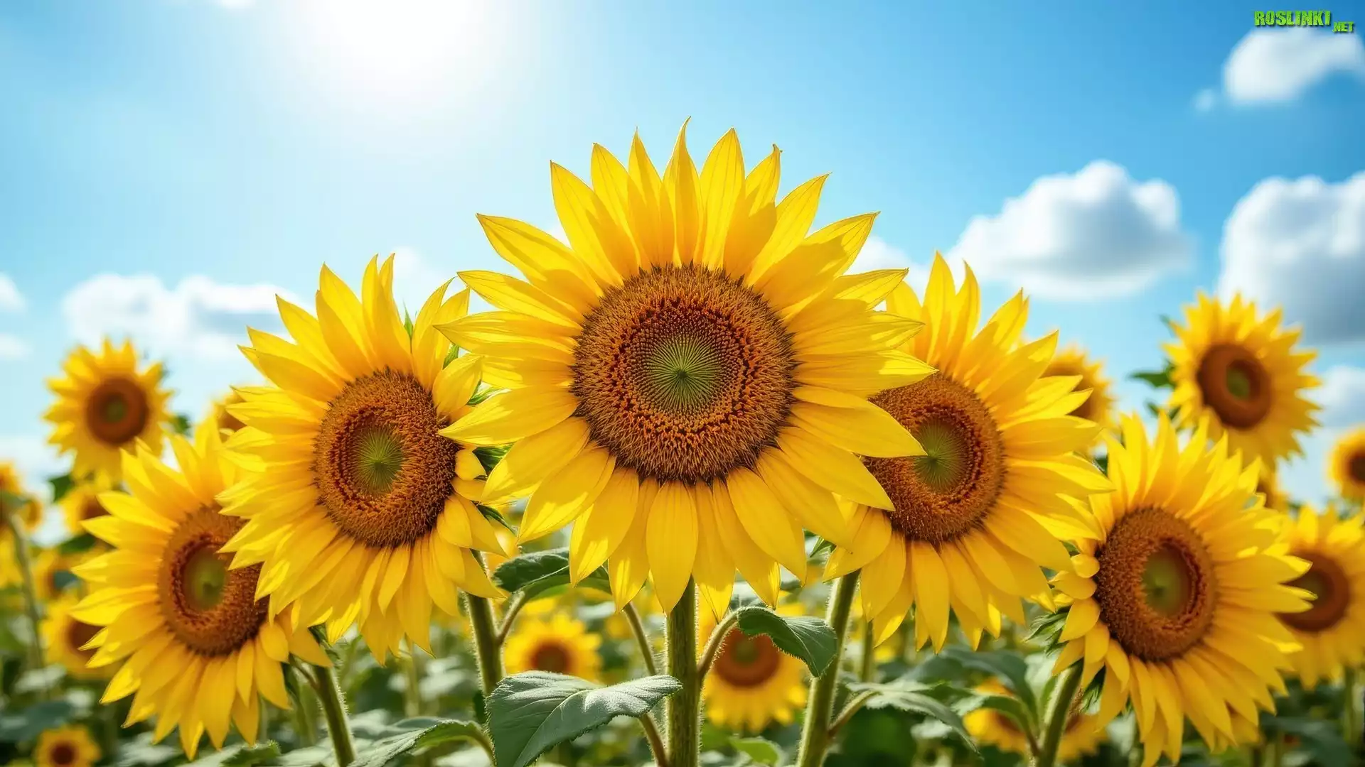 Kwitnące, Słoneczniki, Niebo, Zbliżenie