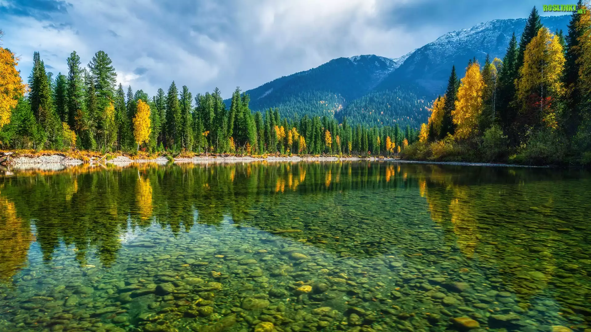 Rośliny: Góry, Jezioro, Las, Zielone, Pożółkłe, Drzewa, Chmury