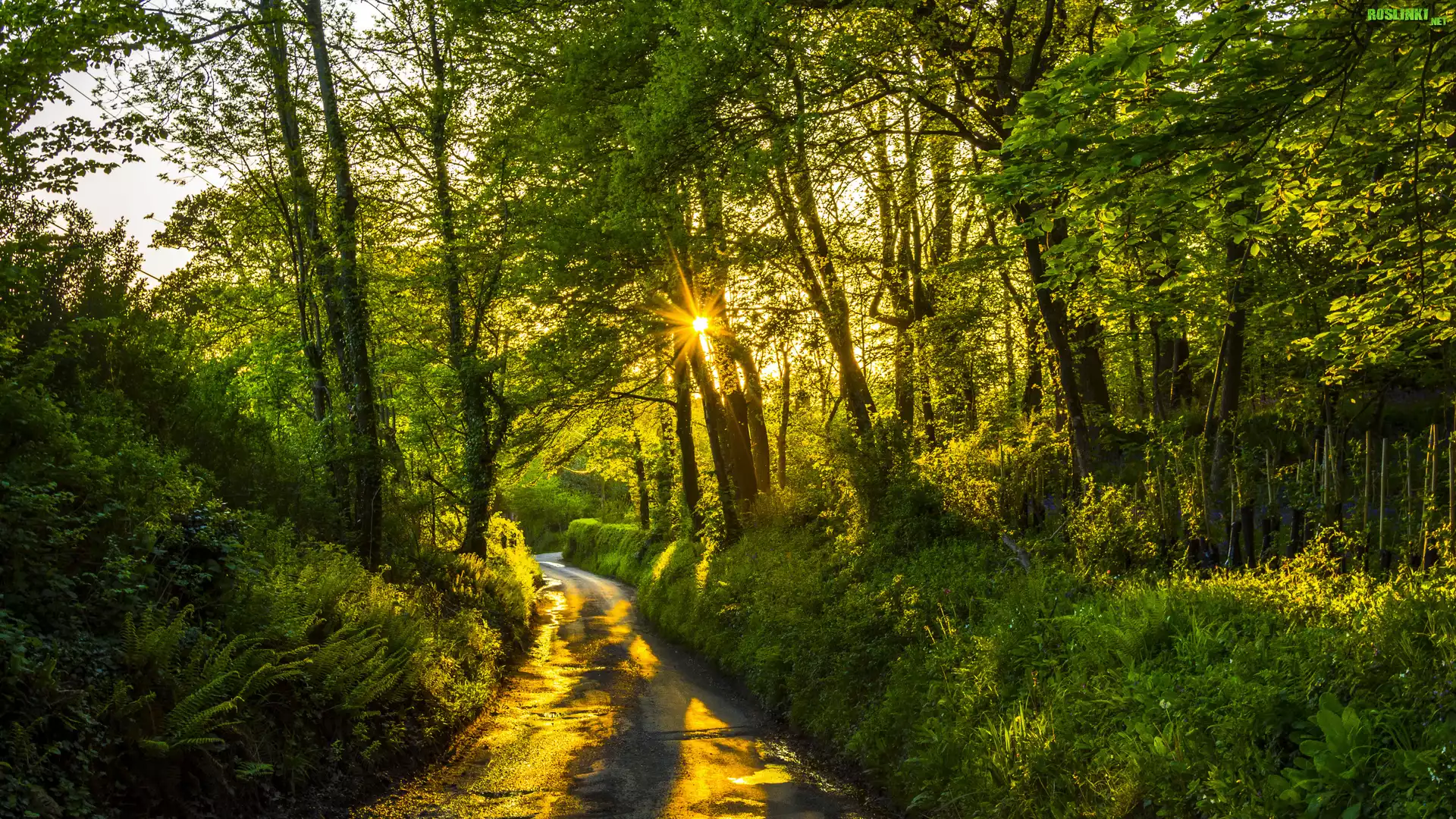 Rośliny: Zielone, Drzewa, Droga, Lato, Promienie słońca