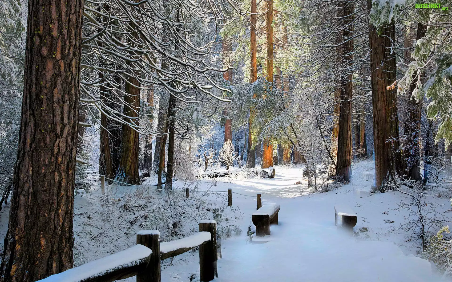Rośliny: Zima, Las, Drzewa, Ławki, Drzewa