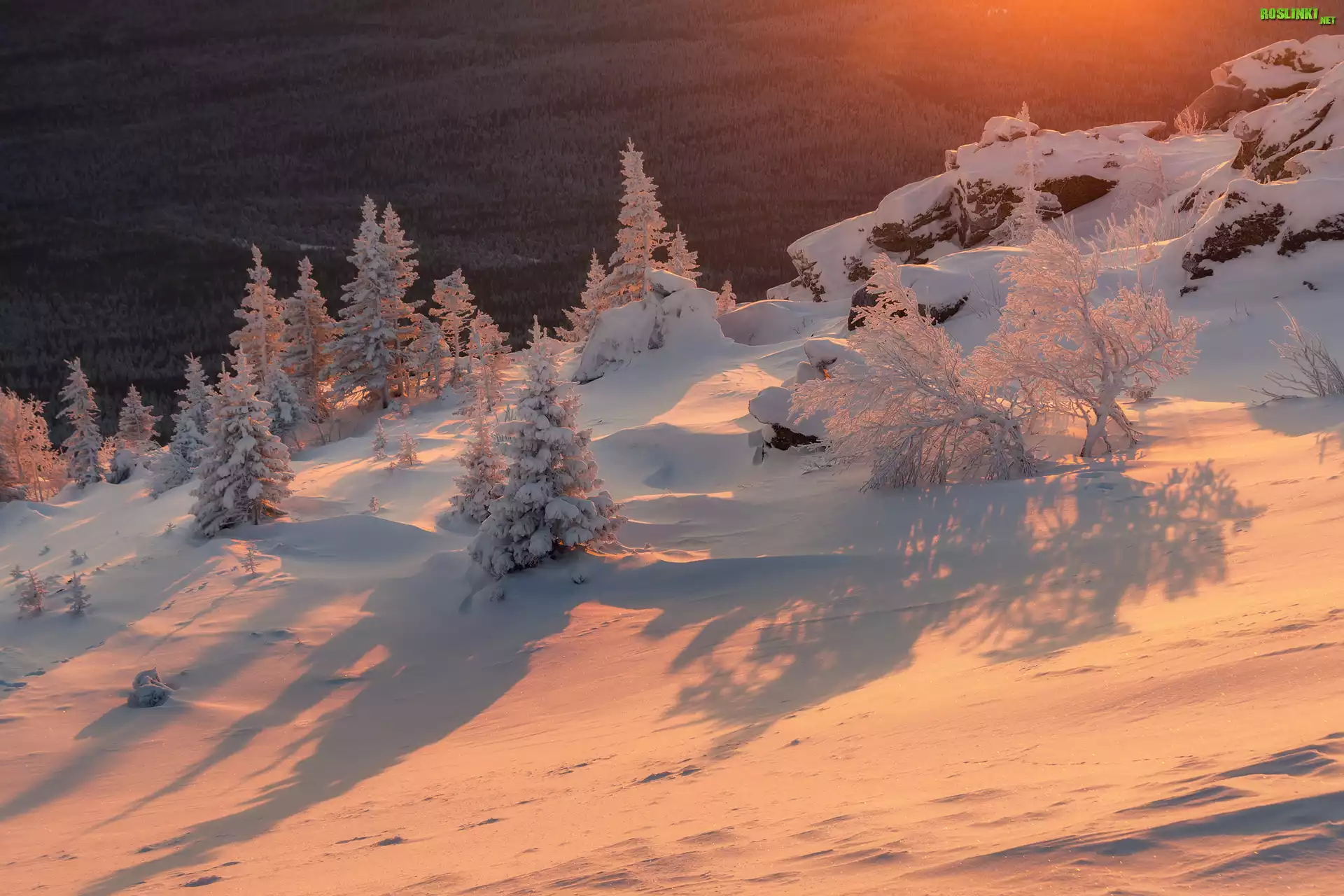 Rośliny: Zimą, Drzewa, Śnieg, Blask słońca
