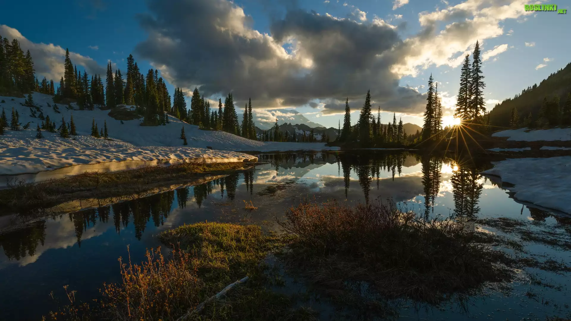 Rośliny: Zima, Las, Jezioro, Góry, Śnieg, Drzewa, Chmury, Wschód słońca