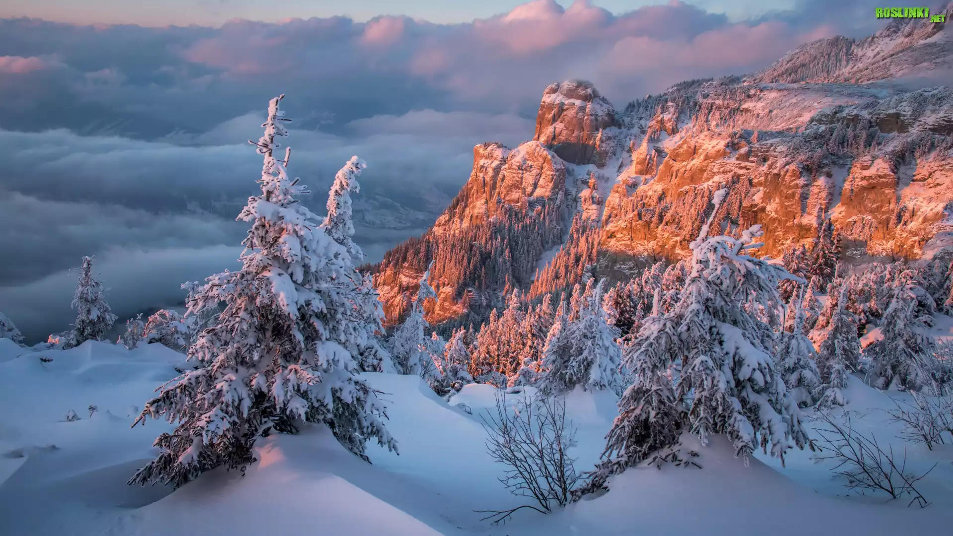 Rośliny: Zima, Śnieg, Góry, Skały, Drzewa, Ośnieżone, Chmury, Zachód Słońca