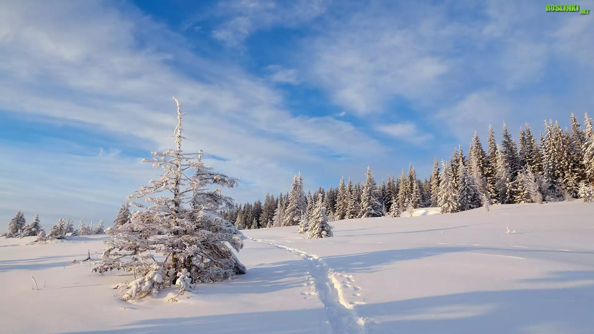 Rośliny: Zima, Las, Świerki, Śnieg, Ścieżka, Chmury