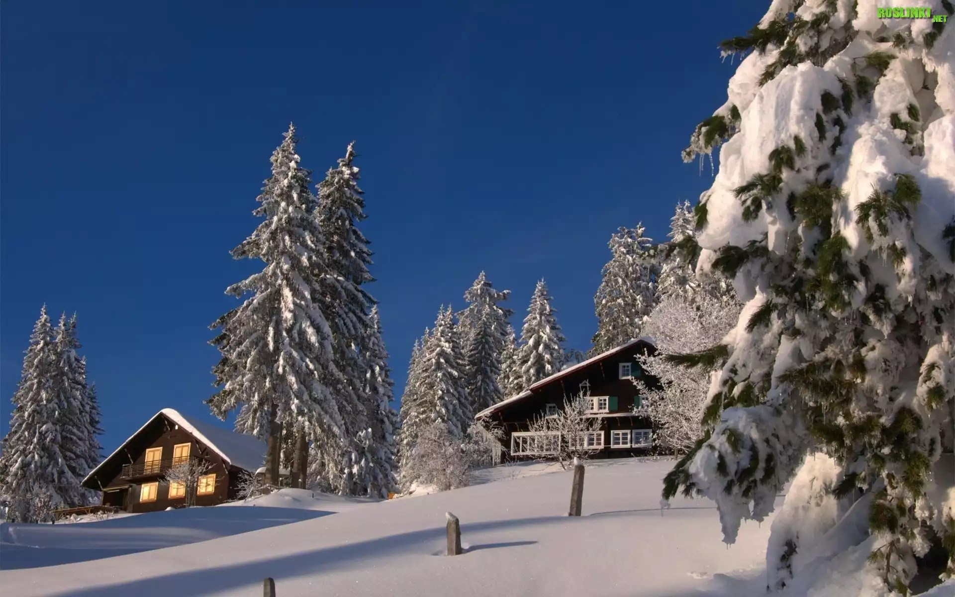 Rośliny: Zima, Domy, Ośnieżone, Iglaki, Czyste, Niebo
