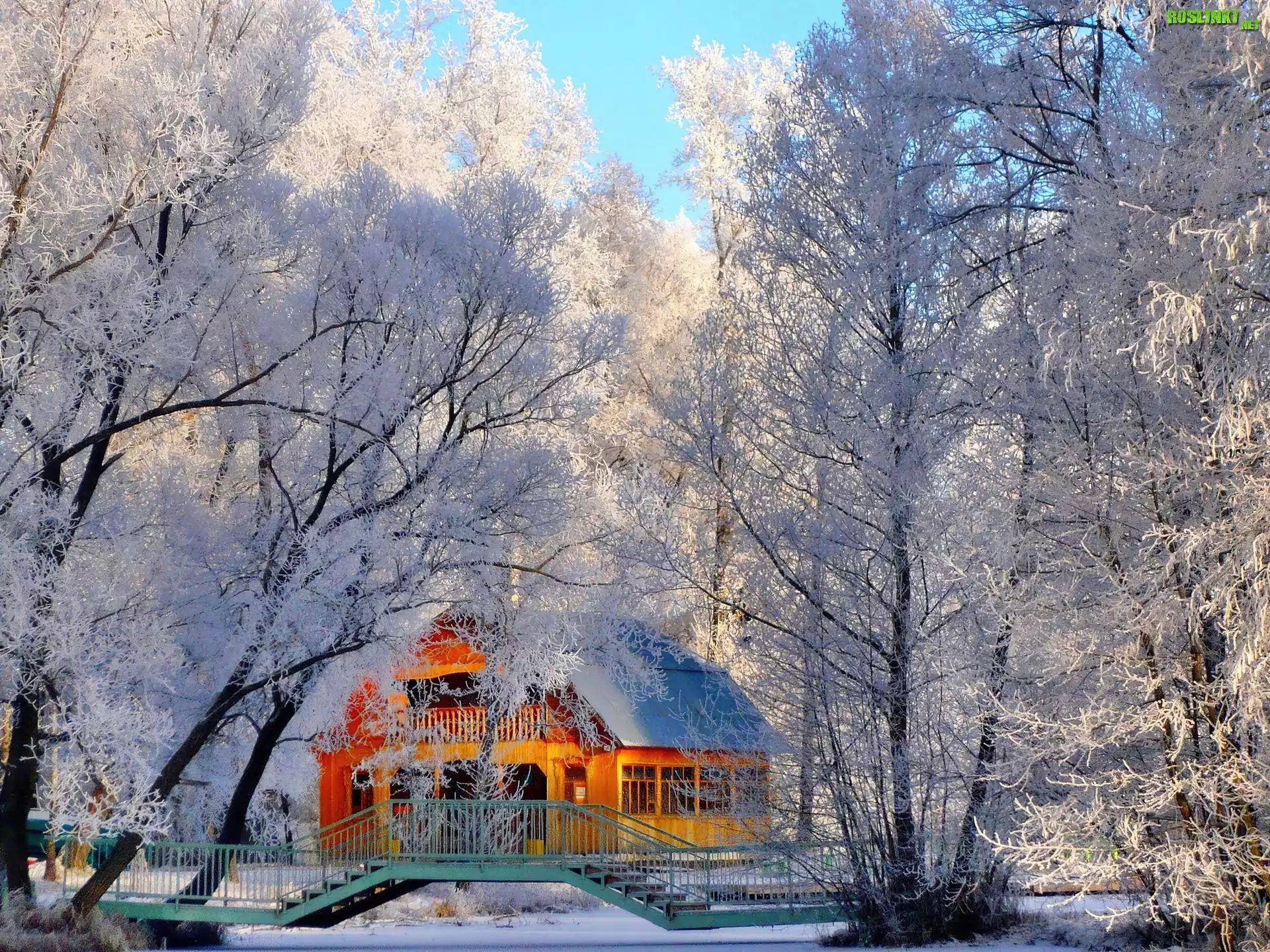 Rośliny: Zima, Drzewa, Dom, Mostek