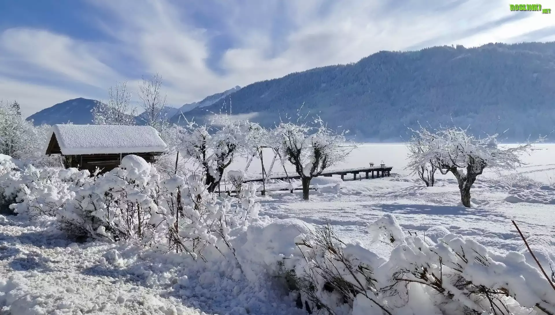 Rośliny: Zima, Śnieg, Drzewa, Dom, Góry