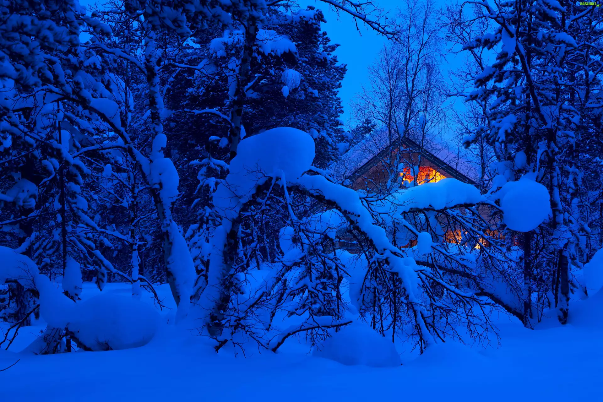 Rośliny: Zima, Ośnieżone, Drzewa, Dom, Zmrok