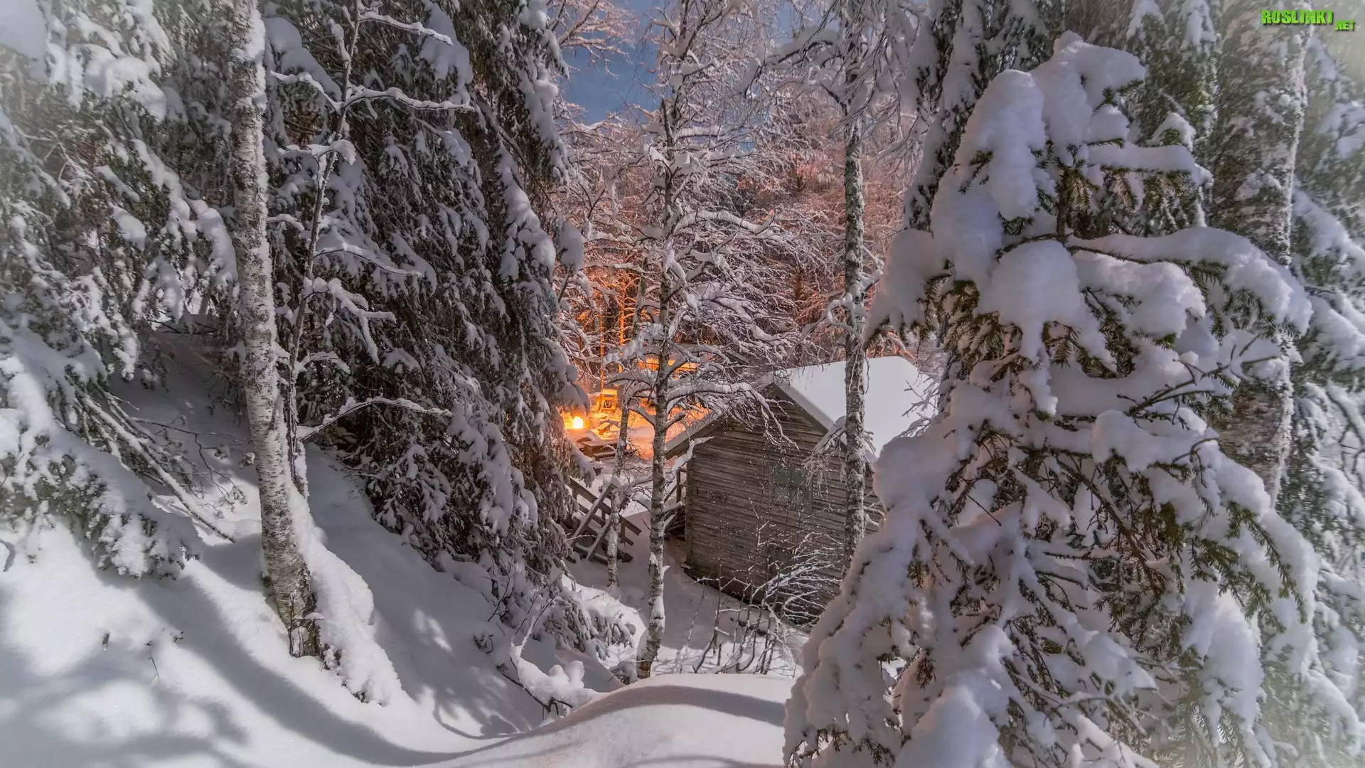 Rośliny: Zima, Las, Ośnieżone, Drzewa, Dom, Oświetlenie