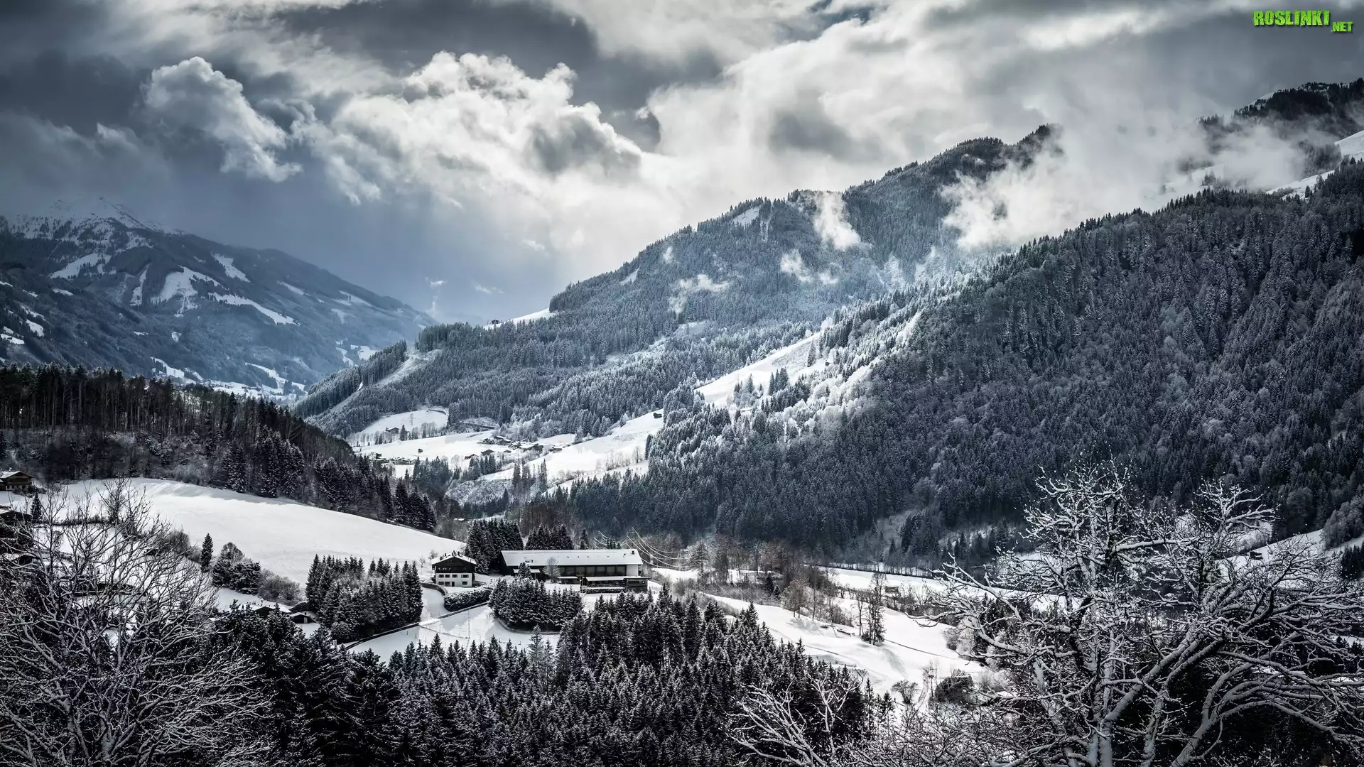 Rośliny: Zima, Góry, Drzewa, Domy, Chmury
