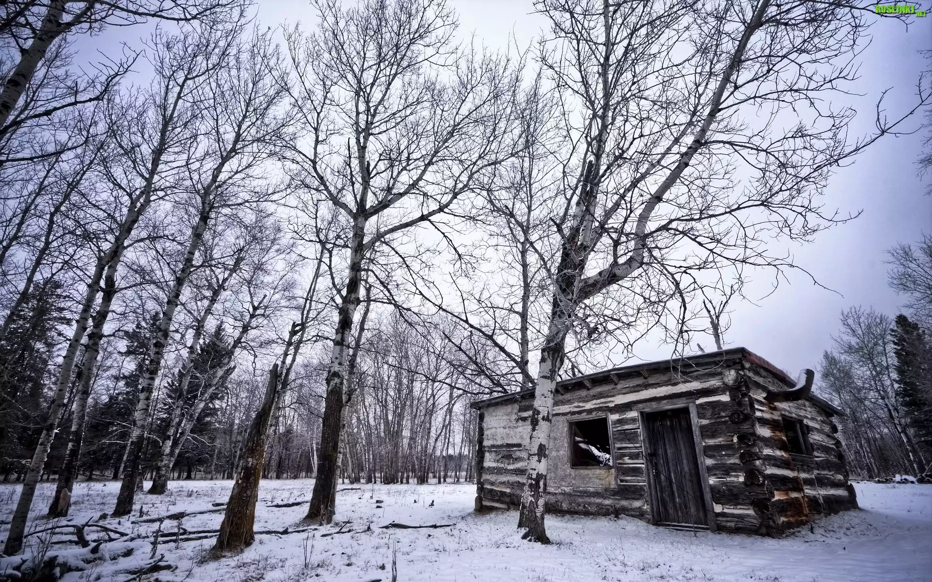 Rośliny: Zima, Drzewa, Drewniana, Chatka