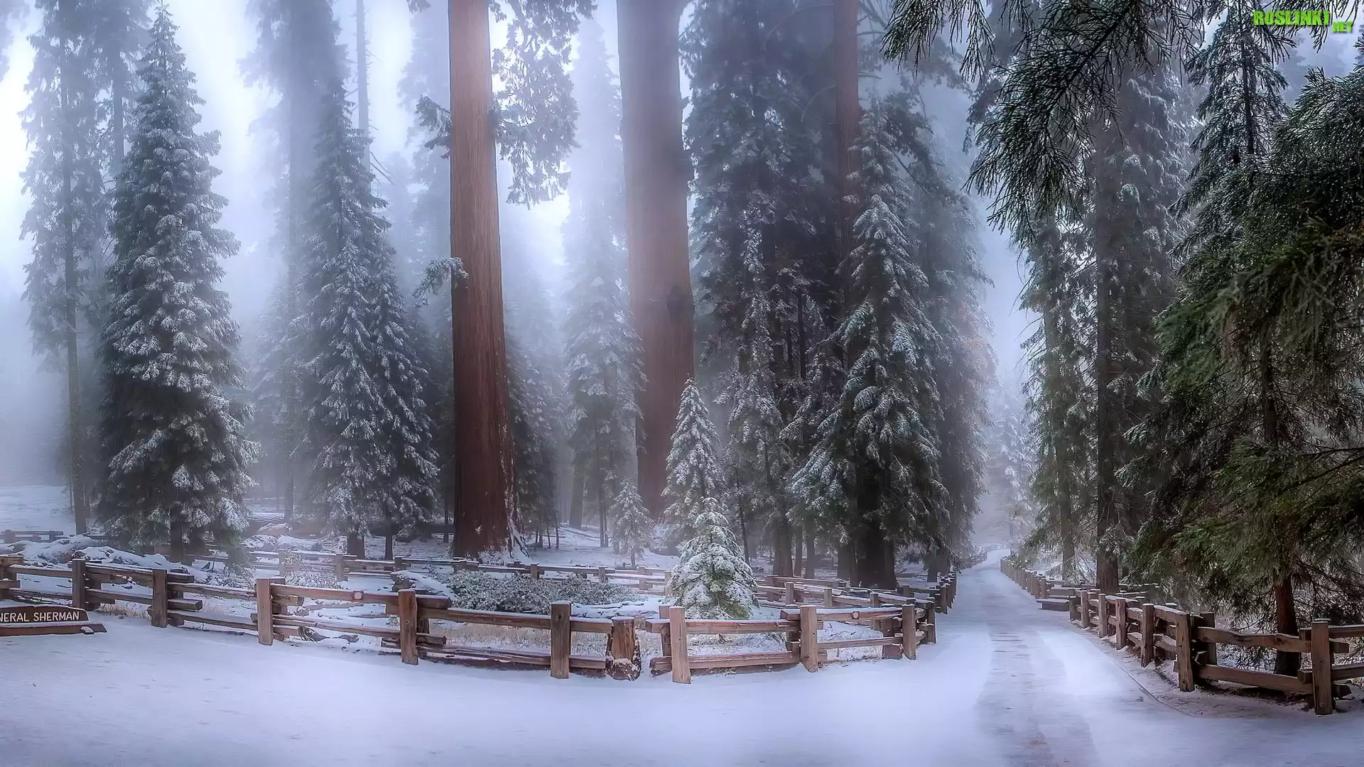 Rośliny: Zima, Las, Drzewa, Mgła, Droga, Płot