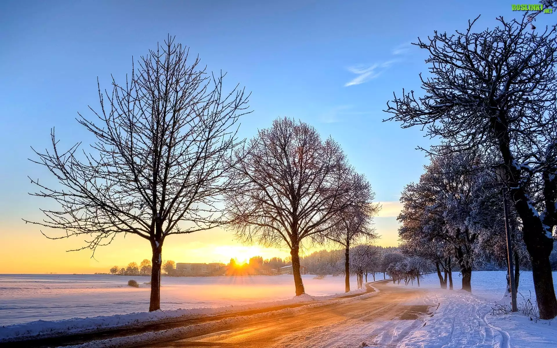 Rośliny: Zima, Wschód, Słońca, Pola, Droga, Drzewa