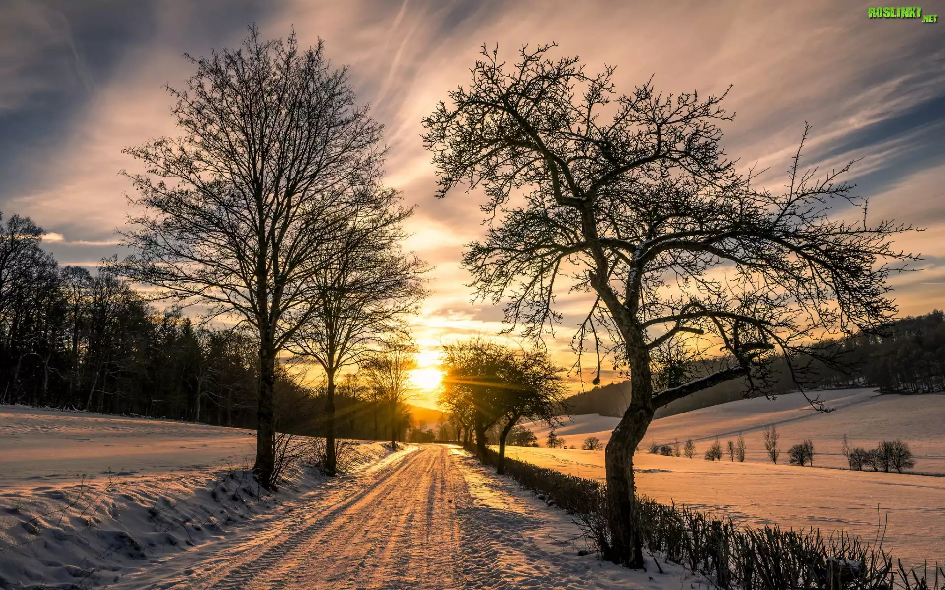Rośliny: Zima, Wschód słońca, Droga, Drzewa