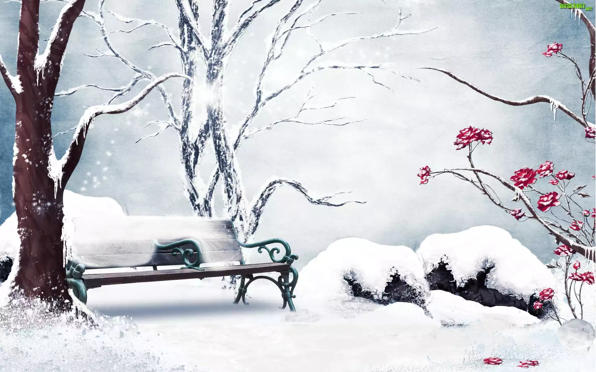 Rośliny: Ławka, Drzewa, Zima, Grafika