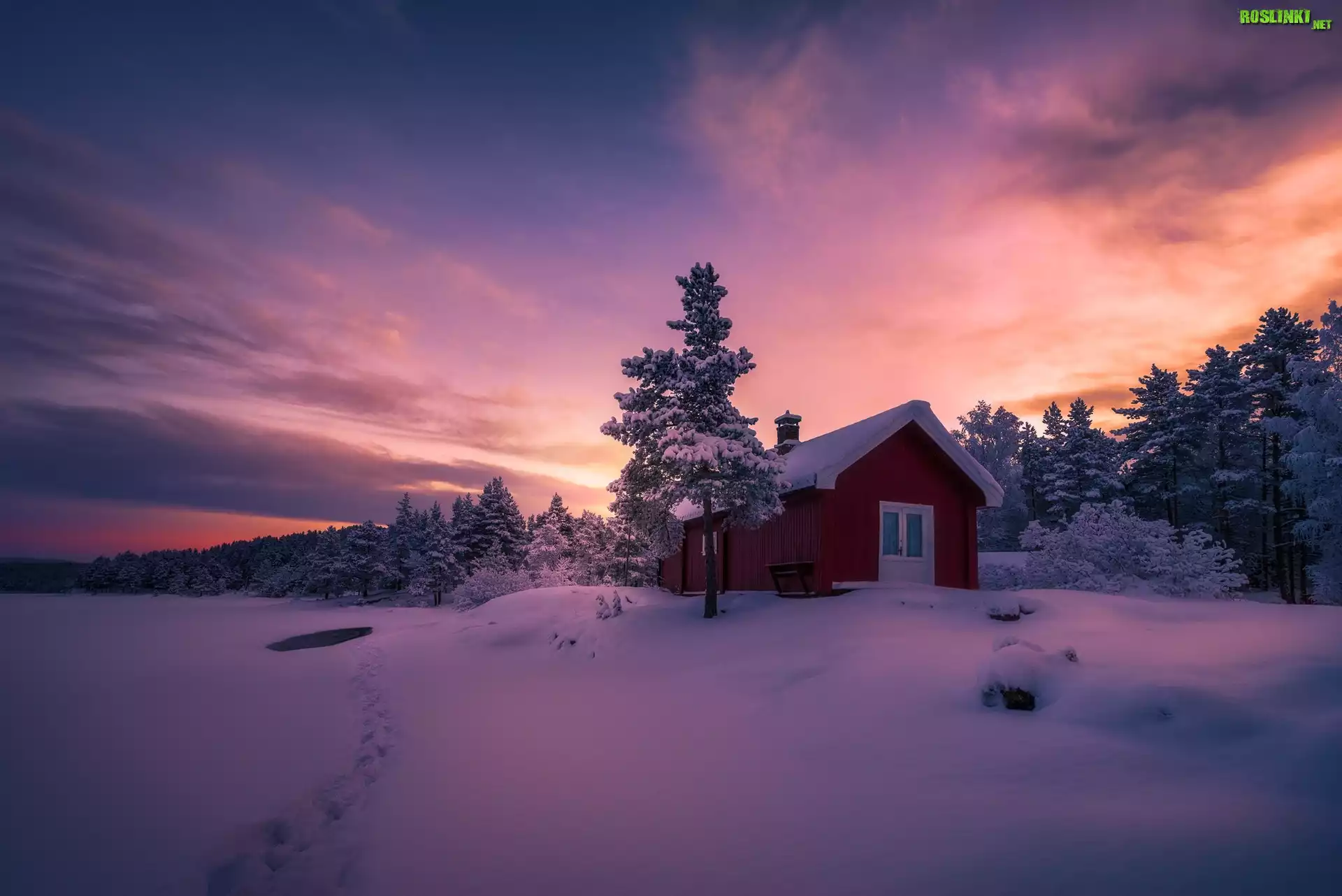 Rośliny: Zima, Ślady, Dom, Drzewa, Zmierzch