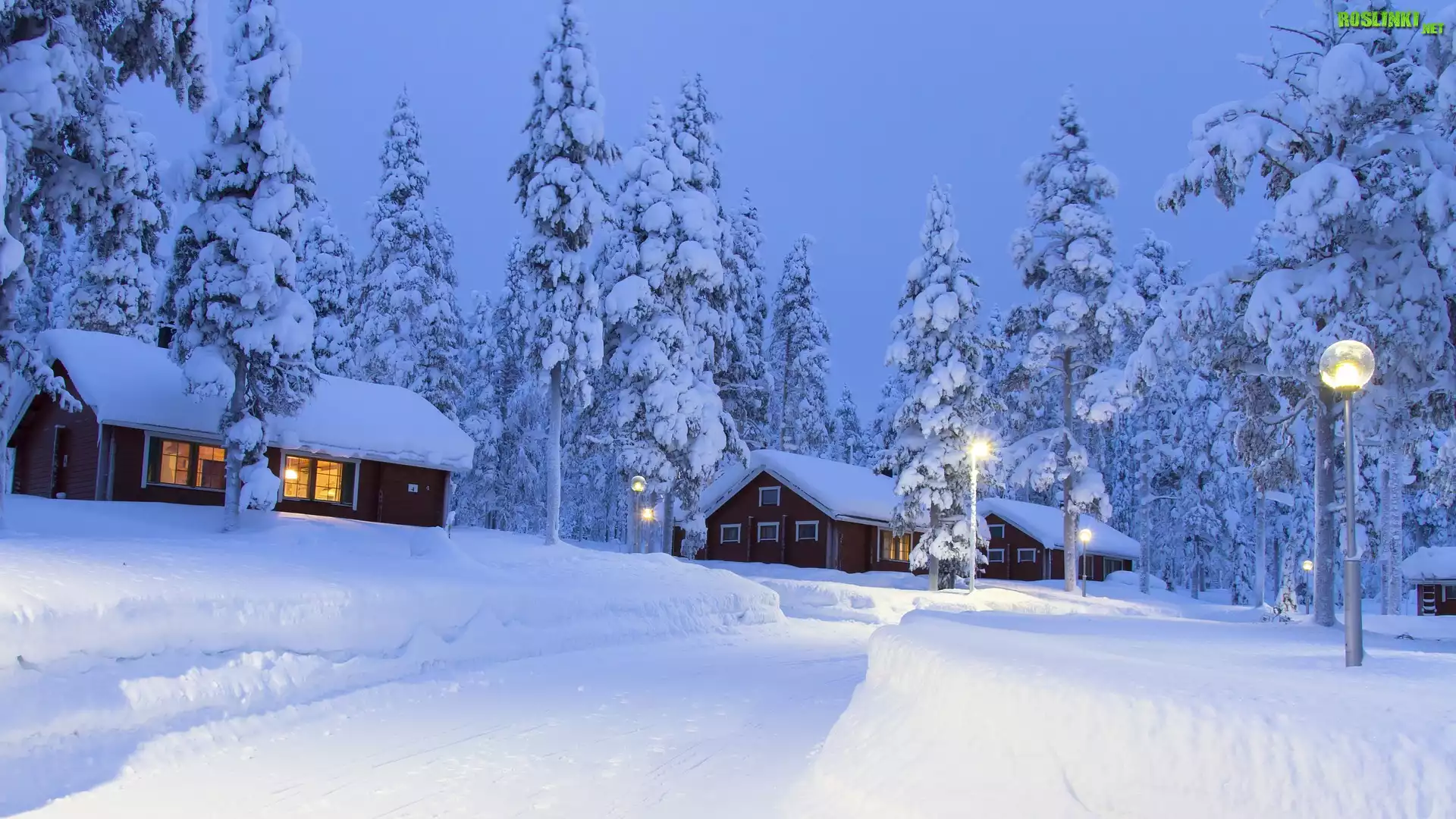 Rośliny: Zima, Śnieg, Domy, Drzewa, Latarnie