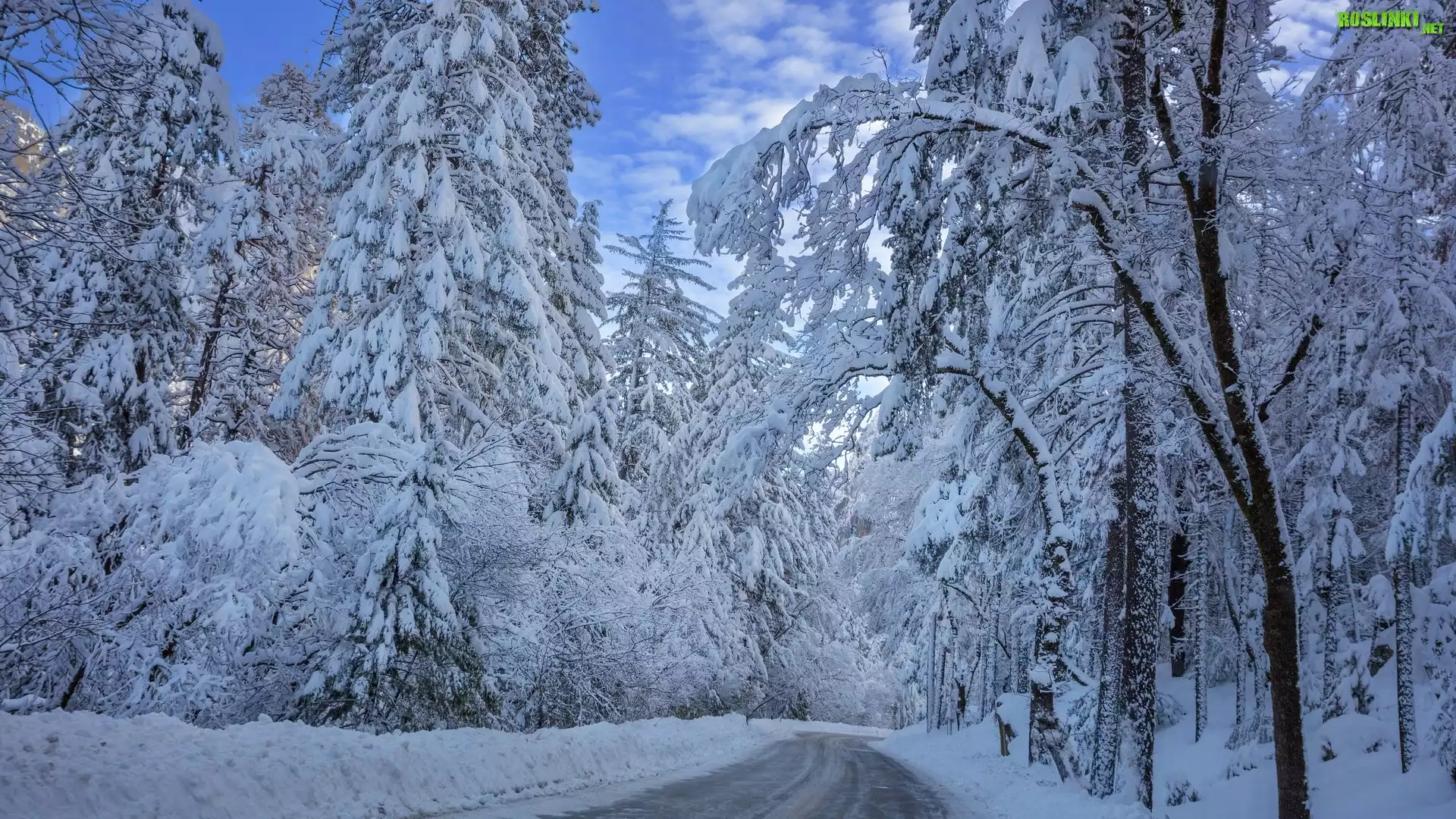 Rośliny: Zima, Las, Droga, Ośnieżone, Drzewa, Chmury