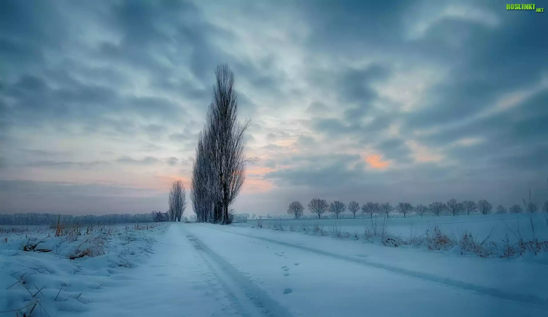 Rośliny: Zima, Pola, Droga, Drzewa, Topole