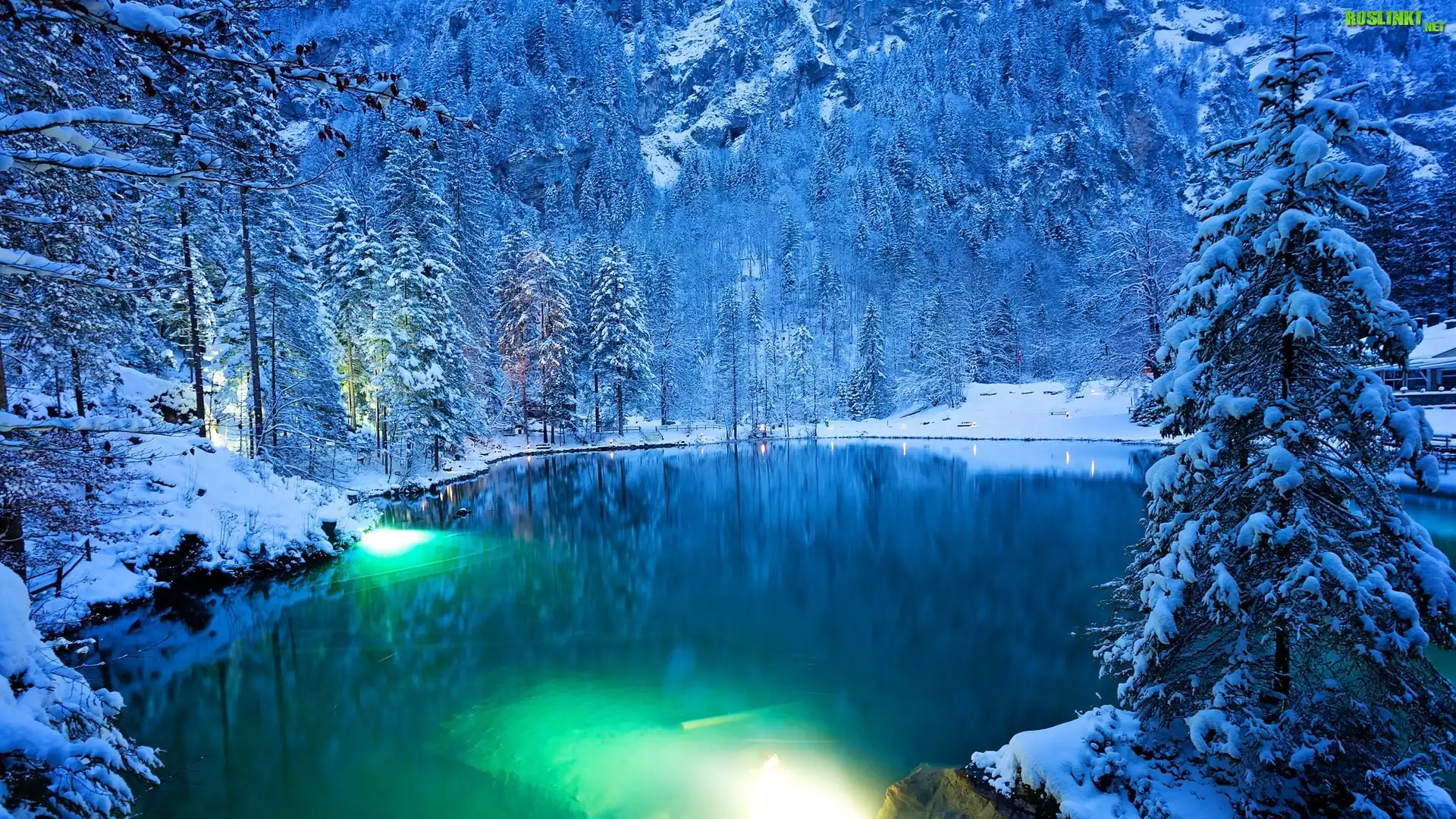 Rośliny: Zima, Jezioro, Drzewa, Świerki