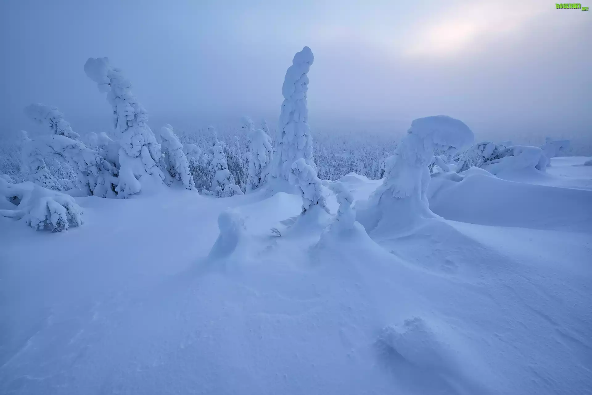 Zima, Finlandia, Laponia, Ośnieżone, Drzewa, Słońce