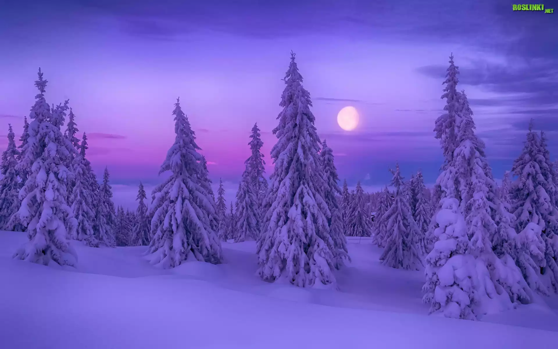 Rośliny: Zima, Noc, Las, Drzewa, Księżyc